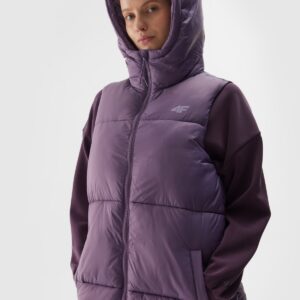 4F Długi bezrękawnik puchowy pikowany z kapturem damski – fioletowy
