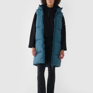 4F Długi bezrękawnik puchowy pikowany z kapturem damski – turkusowy