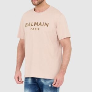 BALMAIN Beżowy męski t-shirt z aksamitnym logo flock and foil, Rozmiar 2