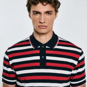 Koszulka męska polo w poziome paski z wiskozą – biało-granatowa V2