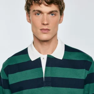 Koszulka męska polo z długim rękawem w pasy granatowo-zielona Miker 403