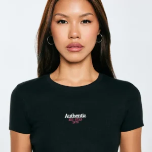 Koszulka damska w prążek z haftem czarna Clarsa 906