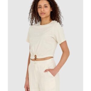 GUESS Kremowy t-shirt damski cropped fit piercing