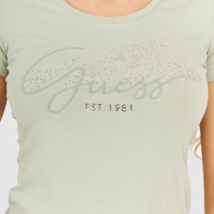 GUESS Jasnozielony t-shirt damski z logo i kryształkami