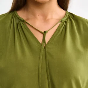 Bluzka damska z wiskozy z ozdobnym wiązaniem przy dekolcie zielona Kortini 303