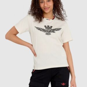 AERONAUTICA MILITARE Kremowy bawełniany luźny t-shirt damski z wypukłym orłem Comfort Fit